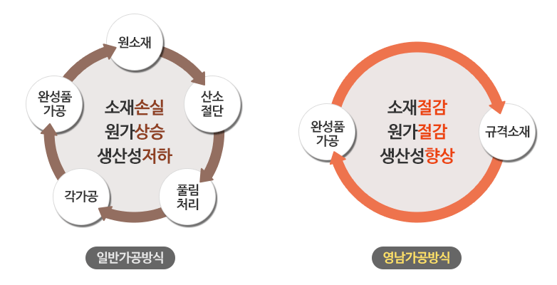 영남 규격소재는 고로에서 만들어진 철판을 톱 절단한 영남규격철판을 사용하여 면가공과 최종규격 절단의 공정을 통해서 생산됩니다.